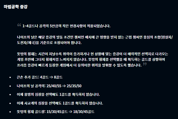 가장 큰 변화는 고대의 기록 보관소(특성의 고서)가 골드 증강체에서 실버 증강체로 변경되었다는게 아닐까 싶습니다. 그 외에는 추방자, 강인함이 너프되었고 태양불꽃판, 사냥의 전율이 버프되었다는 점? 그 외에도 큰손, 뜻밖의 횡재 골드량이 증가했습니다.