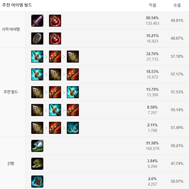 보통 첫 코어 아이템으로 폭풍 갈퀴를 많이 가는데요, 공격력과 치명타 확률, 공격 속도까지 함께 올려주는데 이러한 옵션들은 진에게는 공격력이 비약적으로 상승하게 되죠. 또한 진은 기밀한 발놀림 룬을 찍는데 폭풍갈퀴는 기민한 발놀림 룬과도 잘 어울리고, 게다가 진의 패시브와도 잘 어울리기 때문에 첫 코어 아이템으로는 폭풍갈퀴를 올려주시고, 두 번째 코어 아이템으로는 무난하게 성장한는 경우 고속 연사포를 띄워주시고 만약 본인이 킬을 엄청나게 먹고 초반에 캐리를 해야될 것 같으면 무한의 대검을 뽑아주는 것도 좋습니다. 고속 연사포를 뽑았으면 그 다음템은 무한의 대검을, 반대로 무한의 대검을 뽑았다면 그 다음템은 고속 연사포를 올려주시면 되겠습니다. 그 이후는 상황을 보면서 아이템을 띄워줘야 됩니다.