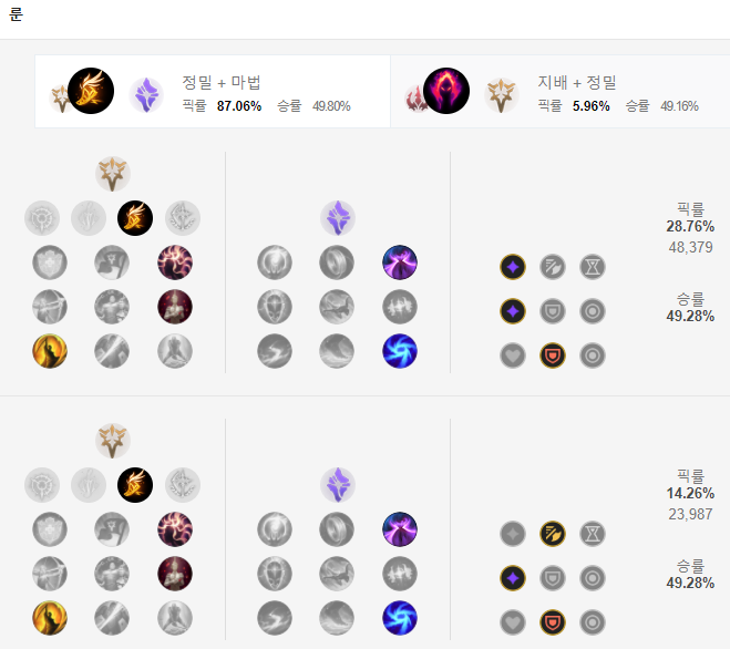 진은 주로 기민한 발놀림 룬을 채택하게 되는데요, 정복자나 다른 룬들이 진과 잘 맞지 않기 때문에 선택의 여지가 없이 기민한 발놀림을 들어주는게 좋습니다. 하위 룬에는 침착과 핏빛 길, 최후의 일격을 주로 선택합니다. 보조 룬으로는 스펠 사용시 카이팅 능력과 생존력을 향상시키는 빛의 망토를, 추가 이동속도를 주는 기민함이나 시간이 흐를수록 강력해지는 폭풍의 결집으로 갈립니다.