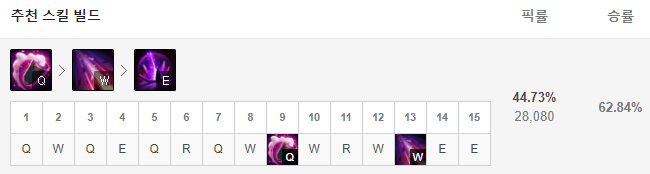 1레벨에는 보통 Q를 찍어줍니다. 정글 리쉬를 도와주고 오면 앞 근거리 미니언 3마리가 피가 상당히 없는데 거기에 Q로 미니언 3마리를 다 먹어주고 원거리 미니언을 바로 공격함으로써 빠르게 라인을 클리어할 수 있습니다. 이 말은 선 2렙을 가져오기가 쉽다는 말이죠. 2레벨에는 W를 찍고 서포터가 공격을 성공시켰을 때 W로 상대방을 맞춘 후 상대방이 속박에 걸리면 평타 한대를 더 넣을 수 있습니다. 3레벨에는 Q를 한번 더 찍어주는게 좋은데요, 사실 연꽃을 설치하는 E스킬은 데미지가 그렇게 높은편은 아니고 밟아도 상대방이 충분히 피할 수 있기 때문에 4레벨에 E스킬을 찍어줍니다. 그 이후에는 R-Q-W-E 순서로 스킬을 마스터해주면 되겠습니다.