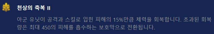 핵심 기물인 요네가 아카데미, 도전자이기 때문에 이와 관련된 증강체를 챙겨주면 좋습니다. 그 외에도 사냥의 전율이나 천상의 축복 시리즈도 무난무난하며, 리롤 관련 증강체나 판도라의 아이템도 좋습니다. 또한 후반 덱을 완성시켰을 때 학자(2) 시너지를 챙겨주기 위해 학자 특성을 챙기는 것도 후반을 바라보면 괜찮은 선택입니다.