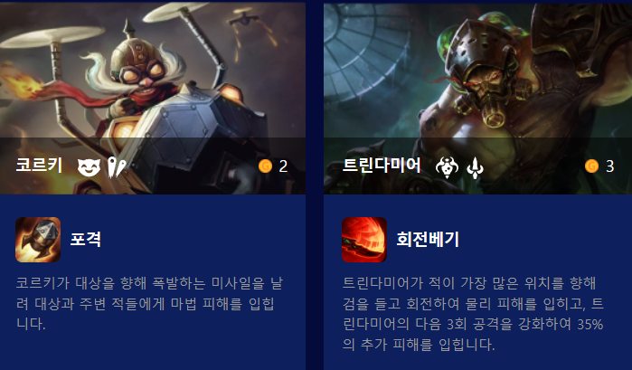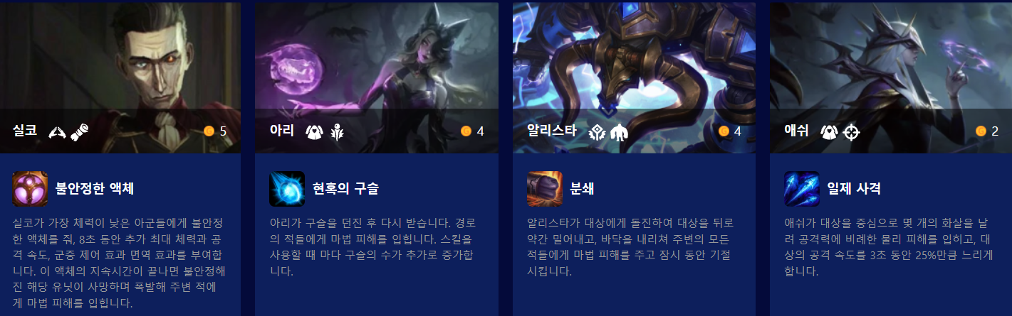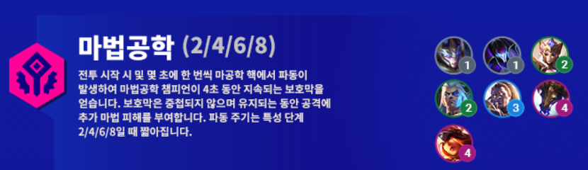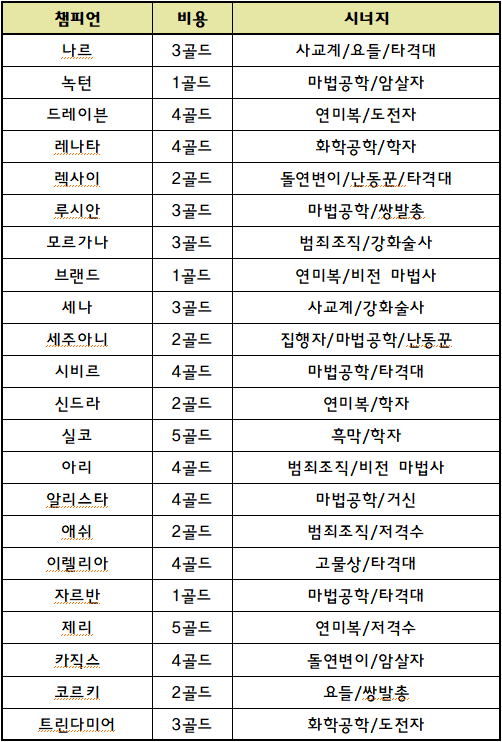 신규 추가된 시너지는 마법공학, 타격대, 연미복, 경쟁자, 흑막 시너지입니다. 이중에서 사실 경쟁자는 기존의 자매가 이름이 바뀌고 효과가 변경된 것이네요. 마법공학은 전투 시작시와 그 후 몇 초마다 한 번씩 마법공학 챔피언들에게 4초동안 지속되는 보호막을 줍니다. 타격대는 단순히 추가 공격력을 얻는 시너지고, 연미복은 추가 체력과 주문력을 얻으며 VIP를 배치하면 고유 추가 효과가 활성화된다고 합니다. 다만 VIP라는 개념이 뭔지는 아직 이해하지 못했습니다. 그 외에 신규 챔피언인 실코의 흑막 시너지는 자신의 앞에 있는 아군들 두 명에게 최대 마나의 일부를 부여합니다.