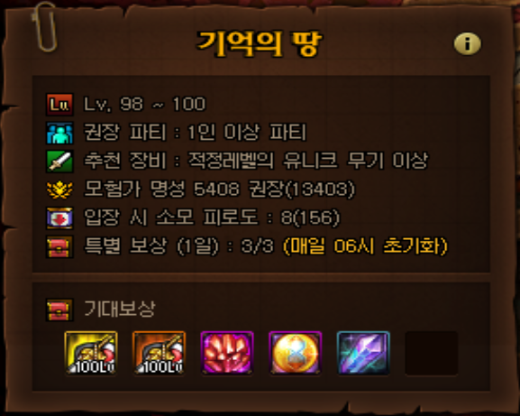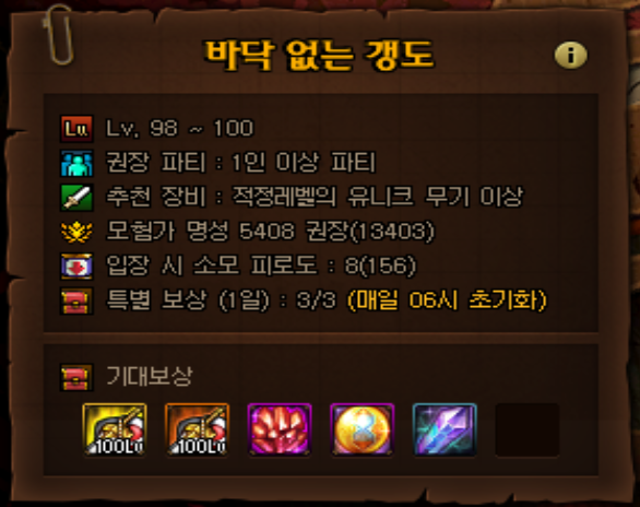 아라드 - 검은 대지에서 오른쪽으로 가면 있는 로스 체스트의 던전으로, 겐트 황궁의 레전더리 버전이라고 보면 됩니다. 겐트 황궁이 유니크 장비를 파밍하는 장소라면, 기갱은 레전더리 장비를 파밍하는 장소입니다. 두 던전 각각 하루 3번 특별 보상이 있기 때문에 하루에 세 번씩은 돌아주도록 합시다. 마찬가지로 낮은 확률로 에픽을 떨구기도 하고, 부가 재료로 시간의 인도석, 아이올라이트, 소멸의 결정을 얻을 수 있습니다. 임페리얼 장비들을 어느정도 둘렀다면 노말 정도는 혼자서도 클리어 가능할 정도이며, 최근에는 많은 사람들이 공쩔을 하기도 하니, 이에 편승하여 손쉽게 돌 수 있습니다. 핵심은 기갱 하루 3번씩, 레전더리 장비 파밍입니다.