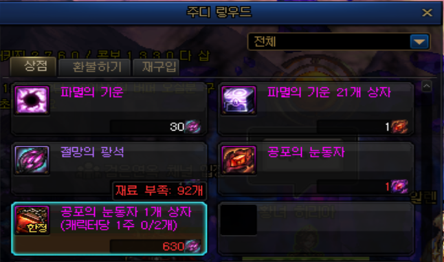 기갱/신지를 돌았을 때 나온 소멸의 결정과 검은 수정으로 목걸이/팔찌/반지/보조장비/어깨/벨트/신발/마법석/귀걸이 보주를 구매할 수 있습니다.