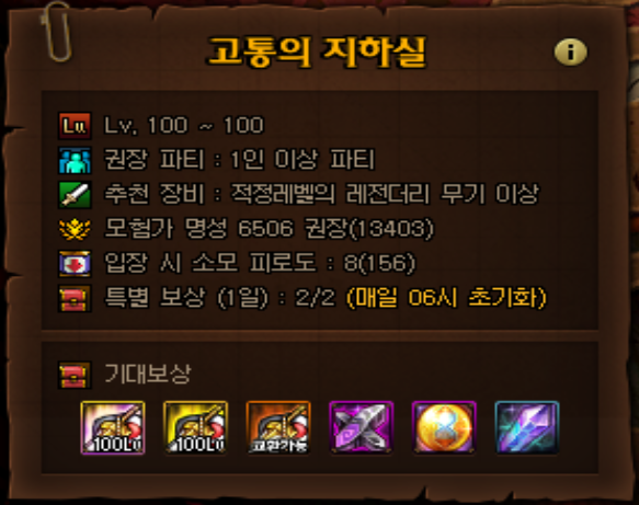 체스트 타운에서 아래쪽으로 이동하면 나오는 검은 연옥의 던전들로 마찬가지로 에픽 장비를 파밍할 수 있습니다. 낮은 확률로 신화 장비가 드랍되며 부가적으로는 공포의 눈동자, 절망의 광석이 있습니다. 위의 신지보다 더 어려운 던전으로 에픽 세트가 다 갖춰진 경우에나 파티를 맺어 도는 것을 추천드립니다. 네 개의 던전 모두 하루 한 번 특별 보상을 받을 수 있기 때문에 가능하면 하루에 한 번씩 클리어를 해주세요.