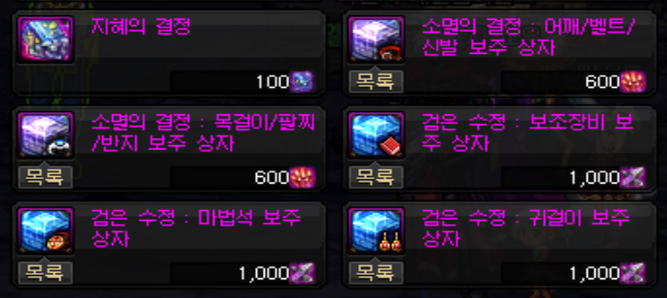 기갱/신지를 돌았을 때 나온 소멸의 결정과 검은 수정으로 목걸이/팔찌/반지/보조장비/어깨/벨트/신발/마법석/귀걸이 보주를 구매할 수 있습니다.