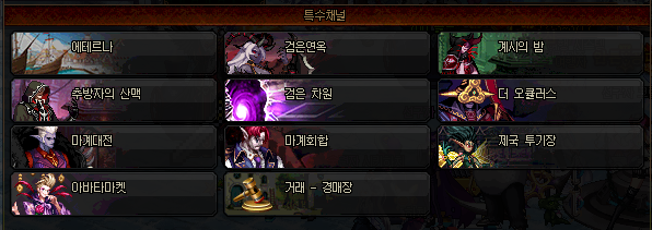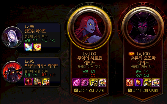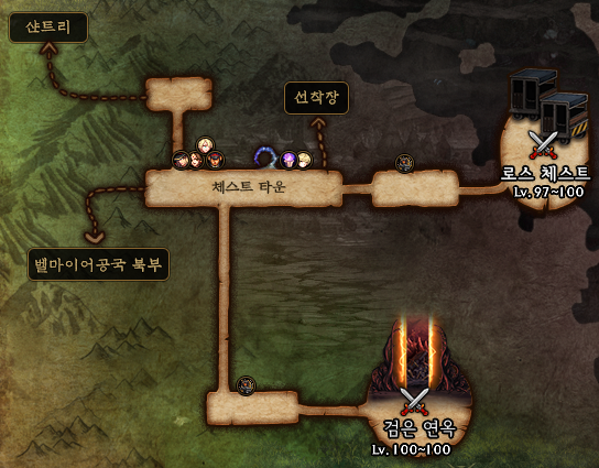 체스트 타운에서 아래쪽으로 이동하면 나오는 검은 연옥의 던전들로 마찬가지로 에픽 장비를 파밍할 수 있습니다. 낮은 확률로 신화 장비가 드랍되며 부가적으로는 공포의 눈동자, 절망의 광석이 있습니다. 위의 신지보다 더 어려운 던전으로 에픽 세트가 다 갖춰진 경우에나 파티를 맺어 도는 것을 추천드립니다. 네 개의 던전 모두 하루 한 번 특별 보상을 받을 수 있기 때문에 가능하면 하루에 한 번씩 클리어를 해주세요.