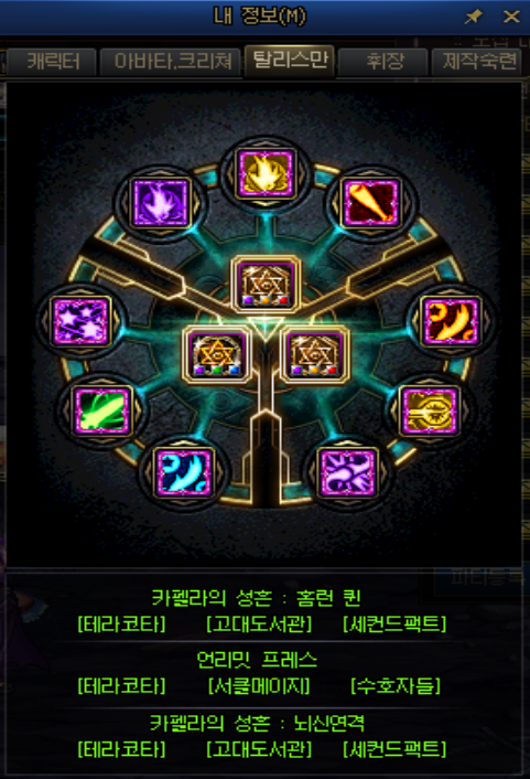 내 정보를 누르면 나오는 탈리스만과 휘장입니다. 탈리스만/룬의 경우에는 특수채널 추방자의 산맥과 마계 대전에 입장하여 나오는 던전을 클리어함으로서 얻을 수 있는데, 매주 1회 특별 보상이 있기 때문에 일주일에 한 번씩은 돌아주길 바랍니다. 휘장/젬은 길드 던전을 통해 얻을 수 있고, 휘장의 경우 강화도 가능하니 길드 던전을 이용해주세요.