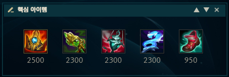 첫 코어 아이템으로는 슈렐리아의 군가를 올리고, 신발은 아이오니아 장화를 올려줍니다. 그 후에는 화학공학 부패기, 불타는 향로, 흐르는 물의 지팡이를 올려주면 됩니다.