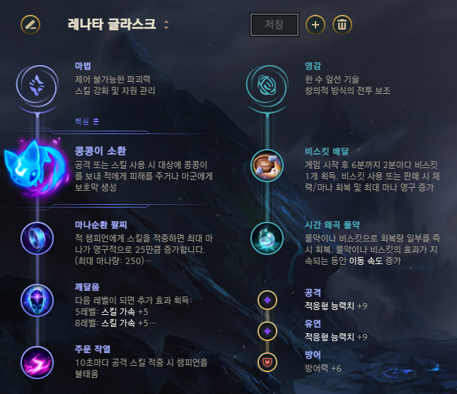 가장 많이 사용되고 있는 레나타 룬은 마법에서 콩콩이를 핵심으로 한 룬입니다. 하위 룬으로는 마나순환 팔찌, 깨달음, 주문 작열을 들어주고 보조룬에다가는 영감의 비스킷 배달과 시간 왜곡 물약을 들어주는 것이죠. 룬 파편의 경우 적응형 능력치 두 개와 방어를 드는게 보통입니다.