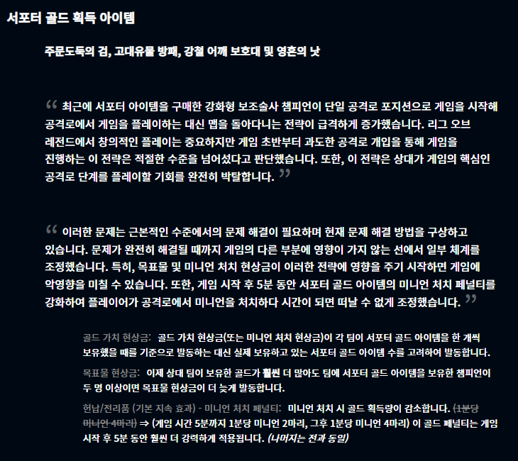 탑 강타 잔나가 떠오르면서 이를 막기 위한 서포터 아이템 패치라고 할 수 있겠습니다. 다만 서포터가 아니더라도 이런 플레이를 다른 챔피언으로 하는 경우들이 있기 때문에 우선은 서포터 역할군의 탑 전향부터 막고 보겠다는 패치라고 생각됩니다.