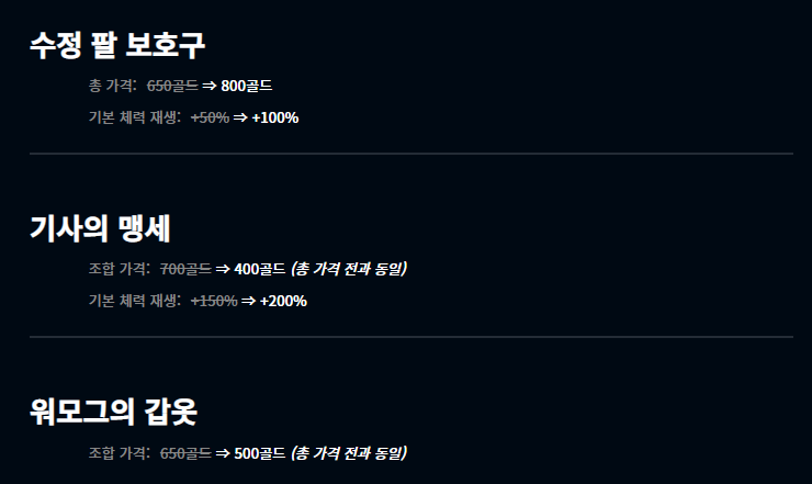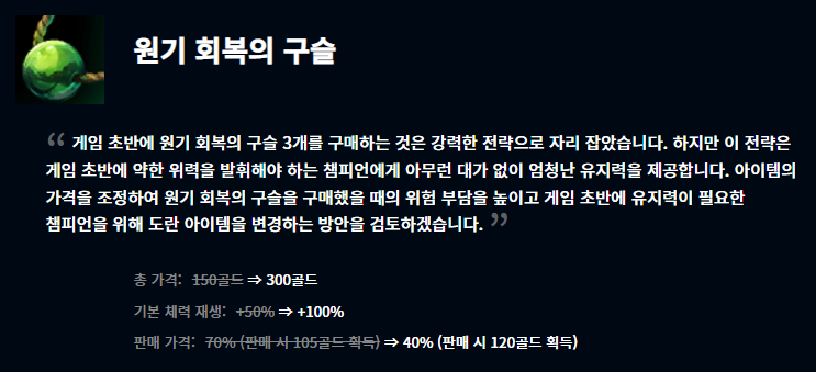 3구슬 시작이 굉장히 라인을 유지하는데 도움이 되고 상점에 되팔아도 70%나 돌려 받기 때문에 강력한 전략으로 자리잡았었습니다. 그렇기 때문에 우선 원기 회복의 구슬을 너프시켰으며, 향후에는 도란 아이템을 변경하는 것을 검토하겠다고 합니다. 원기 회복의 구슬이 너프됨에 따라 상위 아이템들 역시 조금씩 변경이 생겼습니다.