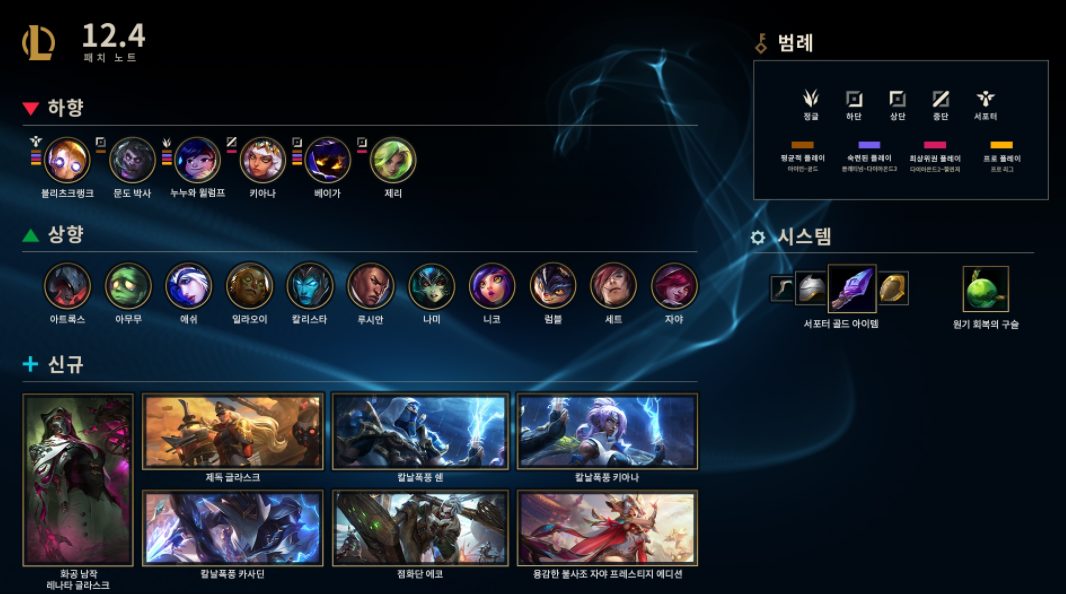 이번 시간에 알아볼 것은 롤 12.4 패치노트입니다. 과연 이번 패치에서는 어떤 챔피언들이 버프되었고, 너프되었는지, 또 다른 변경점들은 무엇이 있는지 하나하나 살펴보도록 하겠습니다.