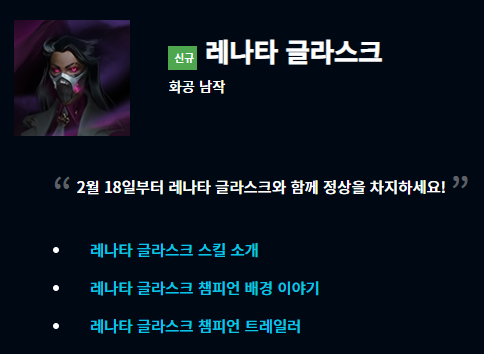 레나타 글라스트는 서포터 포지션으로 궁극기를 적들에게 맞추면 적들이 갑자기 서로를 공격하는 모습을 볼 수 있습니다. 현재는 패치는 된 상태지만 2월 18일부터 사용할 수 있게 됩니다.