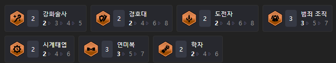 덱을 완성시켰을때 기본적으로 챙길 수 있는 시너지는 강화술사(2), 경호대(2), 도전자(2), 범죄 조직(3), 시계태엽(2), 연미복(3), 학자(2) 시너지입니다. 상징이나 증강체로 시너지를 얻어도 강화술사를 제외하고는 다 두 개의 시너지가 있어야 되기 때문에 위에서 말했다시피 프리즘 증강체의 경우만 시너지쪽을 고르는 것을 추천드립니다.