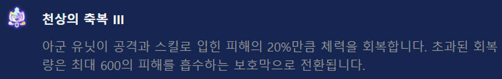 개인적으로는 신규 증강체인 VVIP와 반격태세 시리즈가 굉장히 잘 어울린다고 생각됩니다. 후방 드레이븐이 메인 딜러이며 공격 속도가 빠르면 빠를수록 당연히 입히는 데미지가 더 엄청나지기 때문이죠. 그 외에도 천상의 축복 시리즈도 괜찮다고 생각하며, 시너지 쪽을 얻는 증강체의 경우 무난한 강화술사를 얻는게 좋다고 생각됩니다. 프리즘 증강체라 시너지 두 개를 얻는 경우에는 도전자나 시계태엽을 추천드립니다.