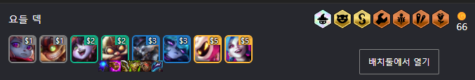 초반에 요들(3) 시너지를 모으는 것이 굉장히 중요하며, 여기에 다리우스를 넣어 경호대(2)를 챙긴다거나 브랜드를 넣어 비전 마법사(2)를 챙긴다거나, 나르가 나왔으면 자르반을 넣어 타격대(2)를 챙기는게 좋습니다. 그러면서 나오는 요들을 계속 모아주는 식으로 플레이하시면 될 듯 합니다.