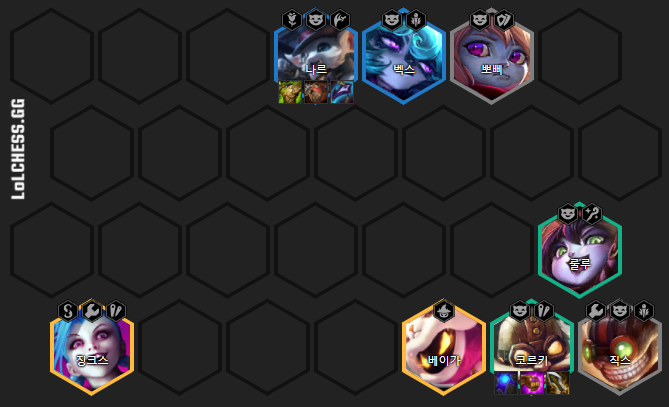 뽀삐, 직스, 룰루, 코르키, 나르, 벡스, 베이가, 징크스로 이루어져 있습니다. 베이가와 징크스가 5코스트이며 7레벨에는 쌍발총 유닛 한 명을 아무나 사용하다가, 징크스와 베이가 중 빨리 나오는 쪽을 사용하시면 됩니다. 이후 8레벨을 찍고 덱을 완성해주면 되구요.