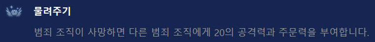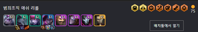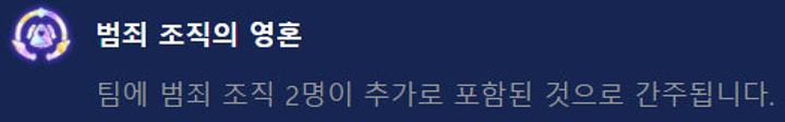 초반에 범죄 조직 관련 증강체나 저격수의 은신처가 나오면 가기 좋은 덱입니다. 그 외에도 천상의 축복, 분쇄기 시리즈 증강체도 잘 어울리며 보석박힌 연꽃도 상당히 좋다고 생각합니다. 그 외에는 특정 유닛 3성을 노리는 덱이기 때문에 상점이나 리롤 관련 증강체들도 좋습니다.