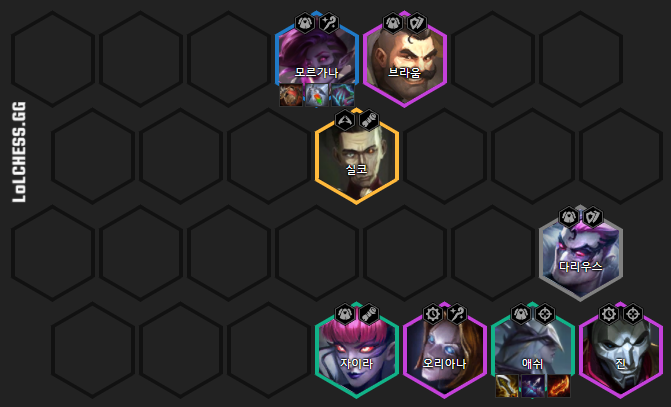 기본 구성은 다리우스, 애쉬, 자이라, 모르가나, 브라움, 오리아나, 진, 실코로 이루어져 있습니다. 시즌6의 트리스타나 리롤덱을 생각하시면 대충 어떤 느낌의 덱인지 이해하기 쉬울 듯 합니다.
