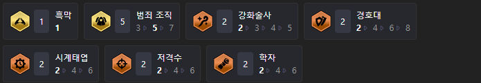 덱을 완성시켰을 때 흑막(1), 범죄 조직(5), 강화술사(2), 경호대(2), 시계태엽(2), 저격수(2), 학자(2) 시너지를 챙길 수 있습니다. 강화술사를 제외하고 나머지 시너지들의 경우 다음 단계의 효과를 적용받으려면 해당 시너지의 챔피언이 두 개가 필요하기 때문에 프리즘 증강체를 제외하고는 시너지 관련 증강체를 고르지 않는게 좋습니다.