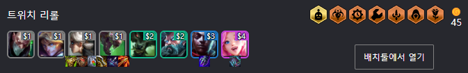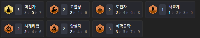 혁신가(5), 고물상(2), 도전자(2), 사교계(1), 시계태엽(2), 암살자(2), 화학공학(3) 시너지를 챙길 수 있습니다. 기존 트위치 리롤덱과 가장 큰 차이는 혁신가(3)이 아닌 혁신가(5)를 받으며 사교계는 덤으로 받는다는 점입니다.