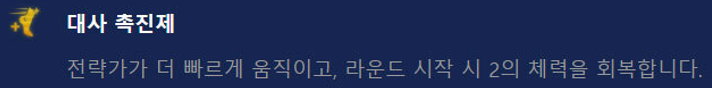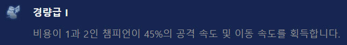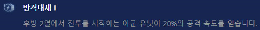 초반에 약하기 때문에 계산된 패배나 대사 촉진제로 어느정도 초반을 버틸 수 있습니다. 또 1, 2코스트 챔피언들이 대부분이라 경량급 시리즈도 좋으며, 배치도 후방에 대부분 배치하기 때문에 반격태세 시리즈도 좋습니다. 상점 관련 증강체중에서는 교환의 장이 특히 좋으며 그 외 전투 관련 증강체로는 신록의 장막이나 아군에게 치감이 없는 경우 태양불꽃판도 추천드립니다.
