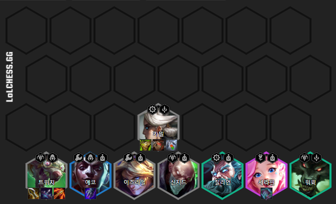 신지드, 이즈리얼, 카밀, 트위치, 워윅, 질리언, 에코, 세라핀으로 이루어져 있습니다. 대부분 1코스트, 2코스트 챔피언들로 이루어져 있기 때문에 초반에 레벨업을 하지 않는 것이 강제되며 그렇기 때문에 초반에는 약할 수 밖에 없는 덱입니다.