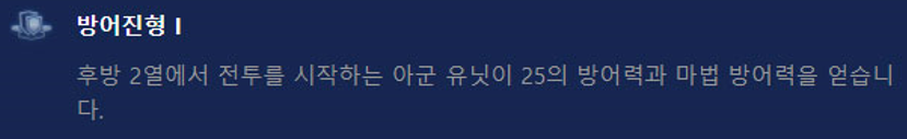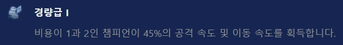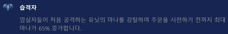 기본적으로 암살자 관련 시너지, 연미복 관련 시너지가 좋습니다. 1, 2코스트 챔피언이 많기 때문에 경량급도 잘 어울리고, 대부분의 챔피언들이 후방에 위치해 있기 때문에 반격태세 혹은 방어진영도 괜찮습니다. 만약 모렐로노미콘을 만들어주기 어렵다면 태양불꽃판으로 대체도 가능합니다.