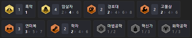기본적으로 덱을 완성시키면 흑막(1), 암살자(4), 경호대(2), 고물상(2), 연미복(3), 학자(2) 시너지를 챙길 수 있습니다. 여기에 이제 추가적으로 암살자 두 개를 모아 암살자(6)이나 학자 두 개를 모아 학자(2)를 가는 식으로 하면 좋습니다.