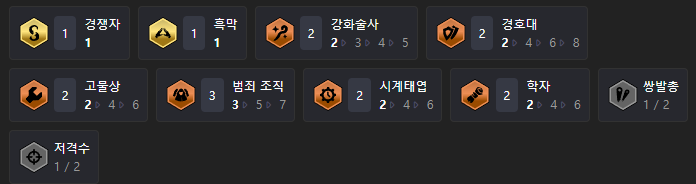 덱을 완성시키면 경쟁자(1), 흑막(1), 강화술사(2), 경호대(2), 고물상(2), 범죄 조직(3), 시계태엽(2), 학자(2) 시너지를 챙길 수 있습니다. 챙길 수 있는 시너지가 높기 때문에 단결된 의지 증강체도 잘 어울린다는 것이죠.
