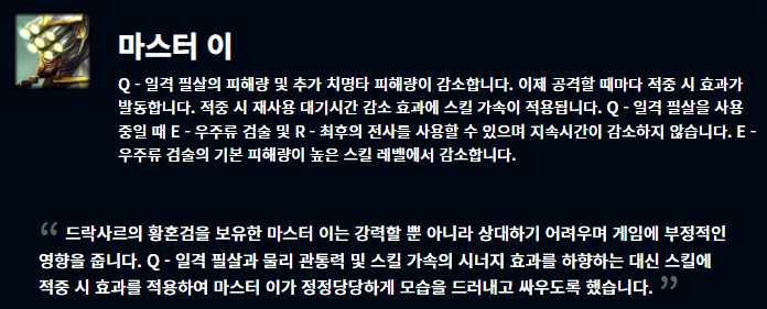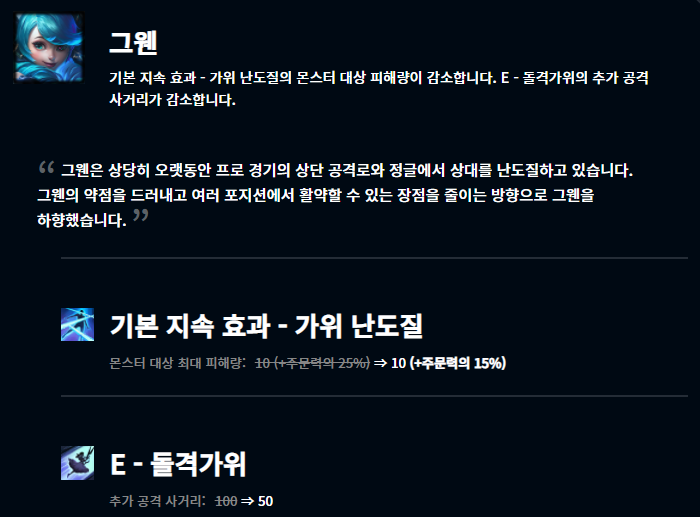 아리, 신 짜오의 경우 1티어 위치에 있기 때문에 그만큼 강력한 모습을 보여주었습니다. 그래서 너프를 진행한 듯 싶으며 그웬의 경우 프로 경기에서 너무 좋은 모습을 보여주고 있어서, 마스터이는 지난 번 패치의 경과를 지켜보고 더 나은 방향으로 가기 위한 너프입니다.