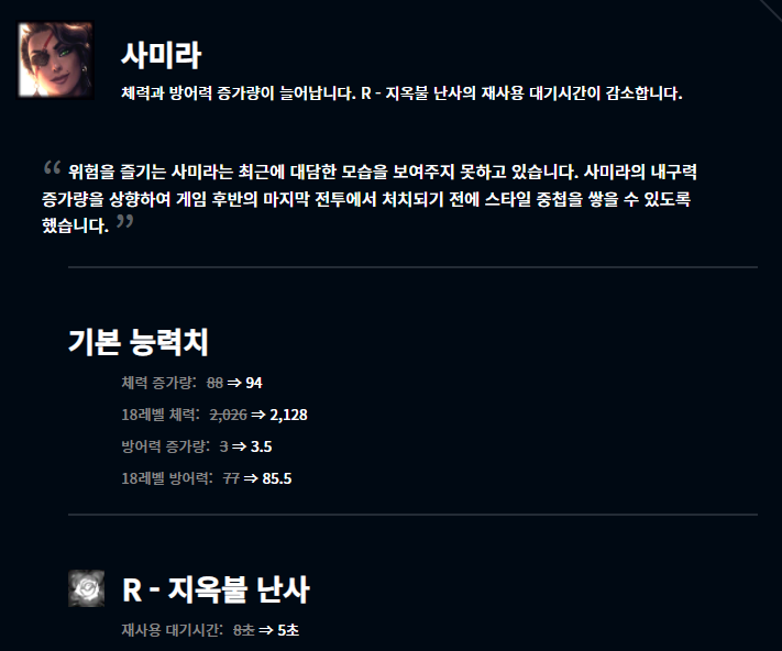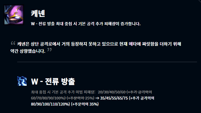 케넨과 사미라 모두 현 메타에서는 자주 사용되지 않는 챔피언입니다. 케넨의 경우 W스킬의 기본 공격 추가 피해량이 증가하였고, 사미라는 기본 능력치의 상향과 궁극기를 더 자주 사용할 수 있도록 지옥불 난사의 재사용 대기시간이 감소했습니다.