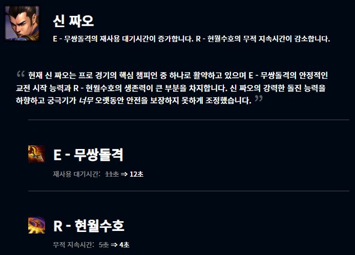 그렇게 큰 변화는 없으며 우선 아리, 마스터이, 신 짜오, 그웬이 너프되었고, 반면 케넨과 사미라는 버프되었습니다. 추가로 세라핀이 변경점이 있으며, 아이템 붑ㄴ에서 선체파괴자의 기본 지속 효과가 변경되었습니다.