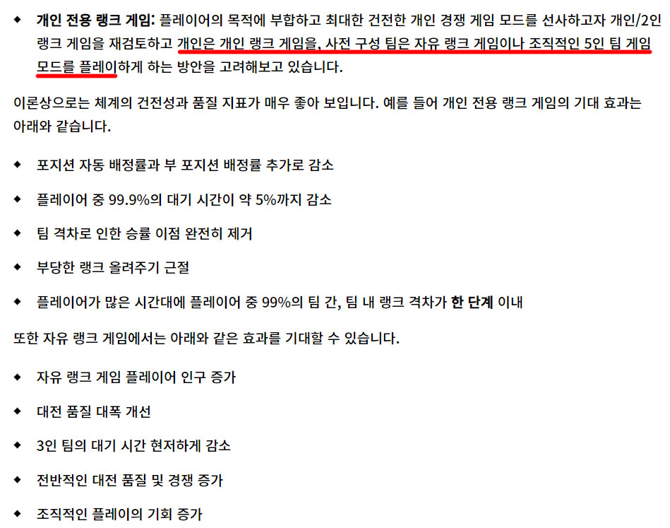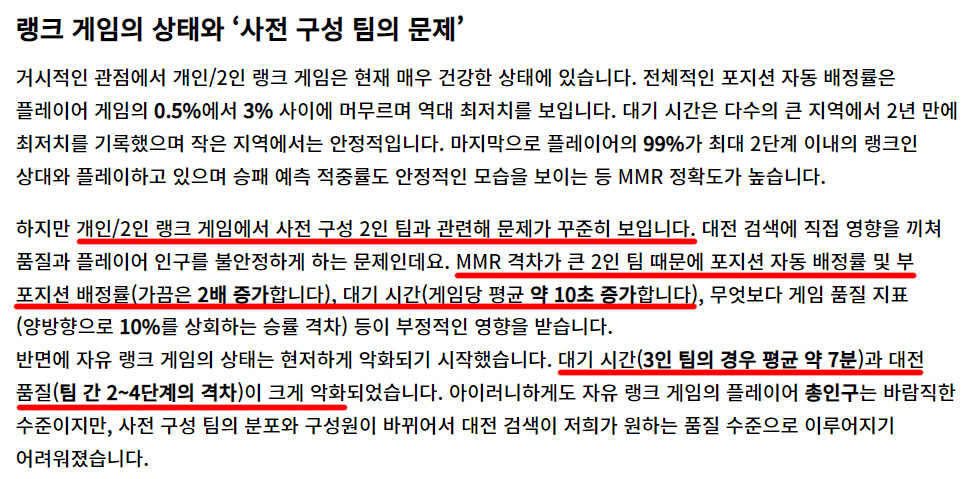 먼저 개인/2인 랭크 게임, 일명 솔랭이라고 불리는 솔로 랭크에서 사전 구성 2인 팀(듀오)과 관련하여 문제가 계속 보인다고 합니다. 듀오를 돌리는 두 명의 MMR 격차가 크기 때문에 포지션 자동 배정률 및 부포지션 배정률 문제, 게임 대기 시간 문제 등이 있다고 합니다. 이와 동시에 자유 랭크 게임 역시 3인 팀의 게임을 하기 위해서는 평균 무려 약 7분이라는 시간을 기다려야 하고, 팀 간의 격차가 크게 악화되었다고 합니다.