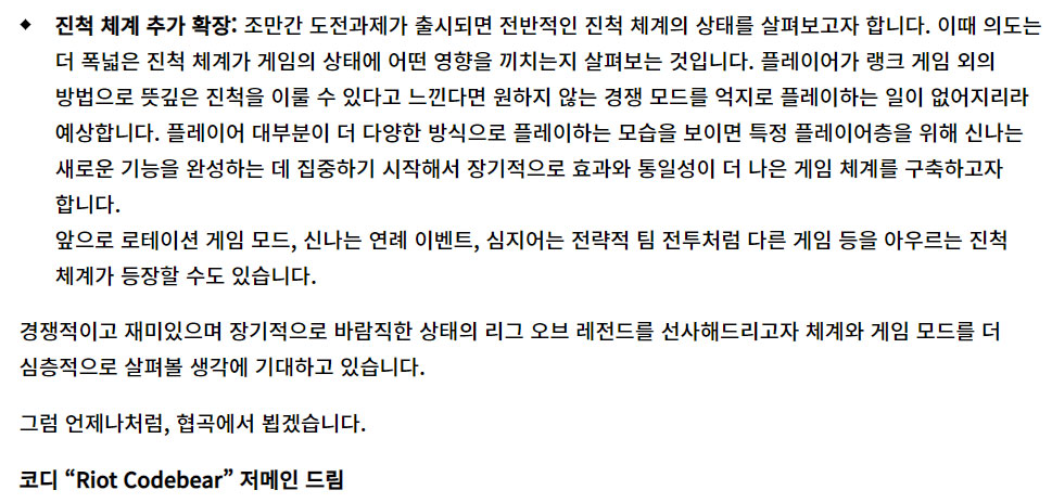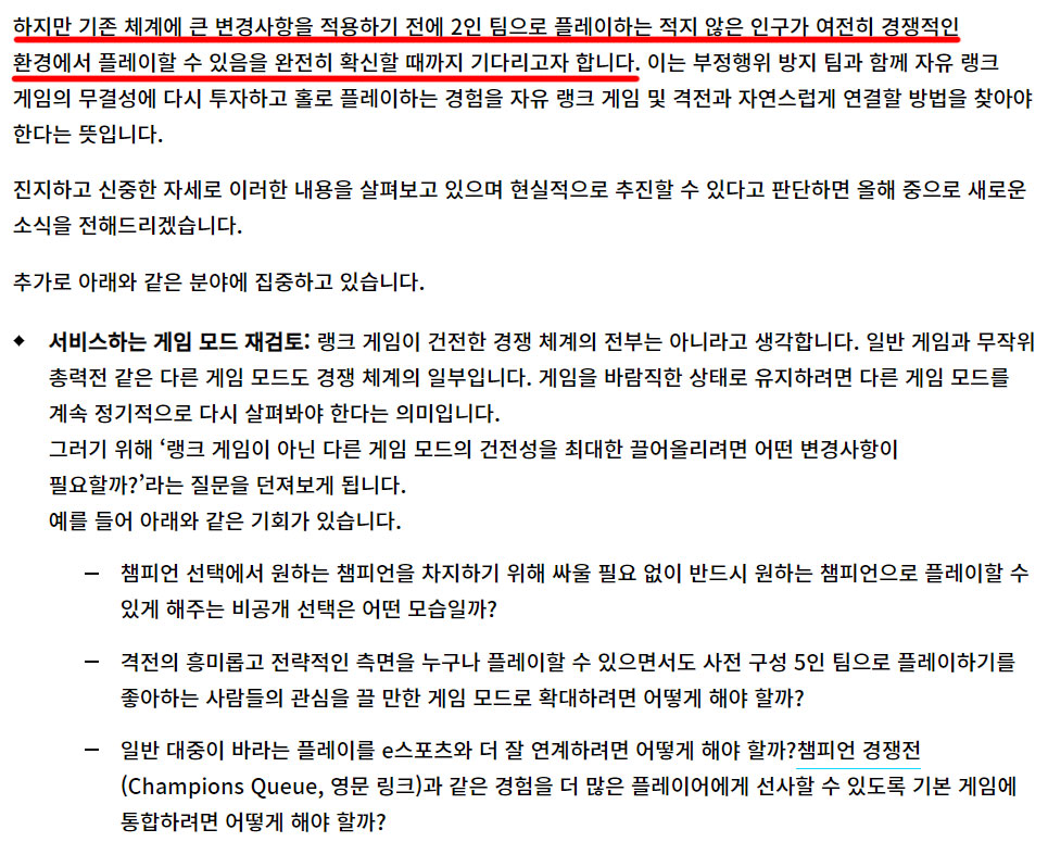 특히 솔로랭크 중 듀오 게임은 랭크를 부정하게 올리는, 소위 말하는 대리 플레이어가 있기 때문에 게임에 큰 악영향을 미친다고 합니다. 그러면서 어떻게 해야될지 살펴보고 있다고 하죠.