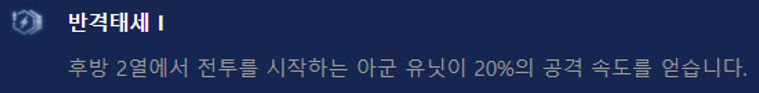 트카이신덱은 딱히 탱커들을 그렇게 앞라인에 두지 않아도 되기 때문에 모든 기물들을 뒷포지션에 두면서 증강체 효과를 모두 적용받게 할 수 있어서 반격태세, 방어진형 시리즈도 추천드립니다.