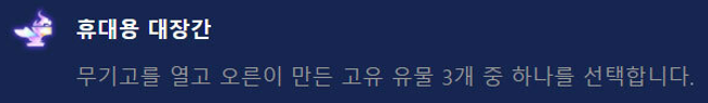 휴대용 대장간에서는 란두인의 성소, 무한한 삼위일체, 황금징수의 총, 영혼의 형상 정도를 뽑으면 좋습니다. 어느정도 운이 필요하며 이미 트위치나 카밀에게 각각 딜템, 탱템을 다 준 상황이라면 그닥 추천드리지는 않습니다.