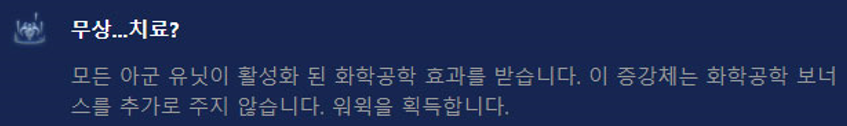 무상...치료?와 검법 증강체는 각각 화학공학, 도전자 기물이 아니더라도 해당 시너지 효과를 받을 수 있게 해줍니다. 트카이신 덱은 화학공학 시너지와 도전자 시너지를 둘 다 가지고 있기 때문에 가볼만 한 증강체입니다.