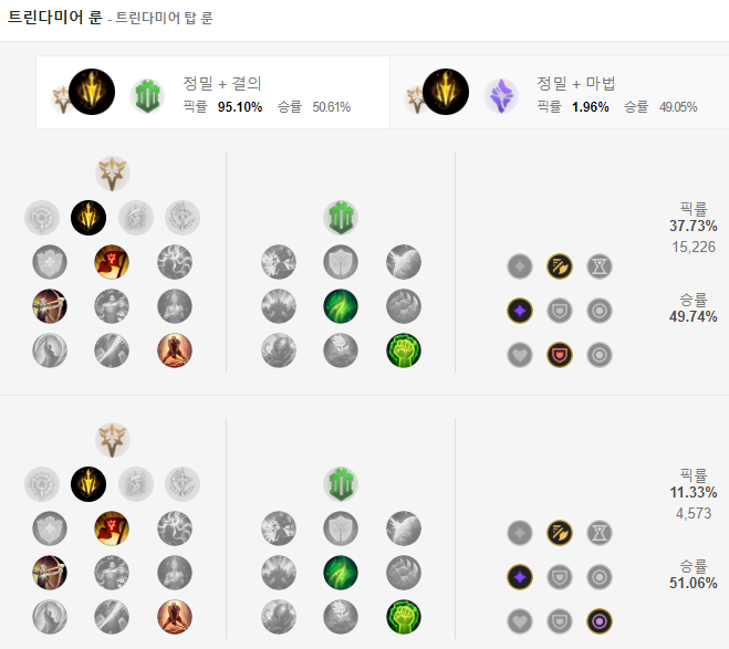 트린다미어 룬은 정밀의 치명적 속도를 들어줍니다. 하위 룬은 승전보, 전설: 민첩함, 최후의 저항을 들어주고 보조룬으로는 결의에서 재생의 바람과 불굴의 의지를 들어줍니다. 룬 파편에는 공격 속도와 적응형 능력치, 그리고 상대방이 AP냐, AD냐에 따라 방어력, 마법 저항력을 선택하면 됩니다.