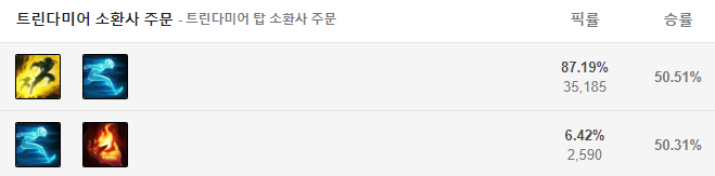 먼저 스펠은 점멸과 유체화를 들어줍니다. 스킬에 이동기가 있지만 그럼에도 불구하고 트린다미어는 공격 사거리가 근접 챔피언들중 제일 짧기 때문에 유체화를 들어주는 것이 궁극기를 사용한 뒤 킬을 따내는데 수월합니다.