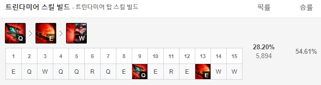 트린다미어 스킬 찍는 순서는 1레벨에는 E스킬, 2레벨에는 Q스킬, 3레벨에는 W스킬을 찍어준 뒤 그 이후부터는 R-Q-E-W 순서로 스킬을 마스터해주면 됩니다.