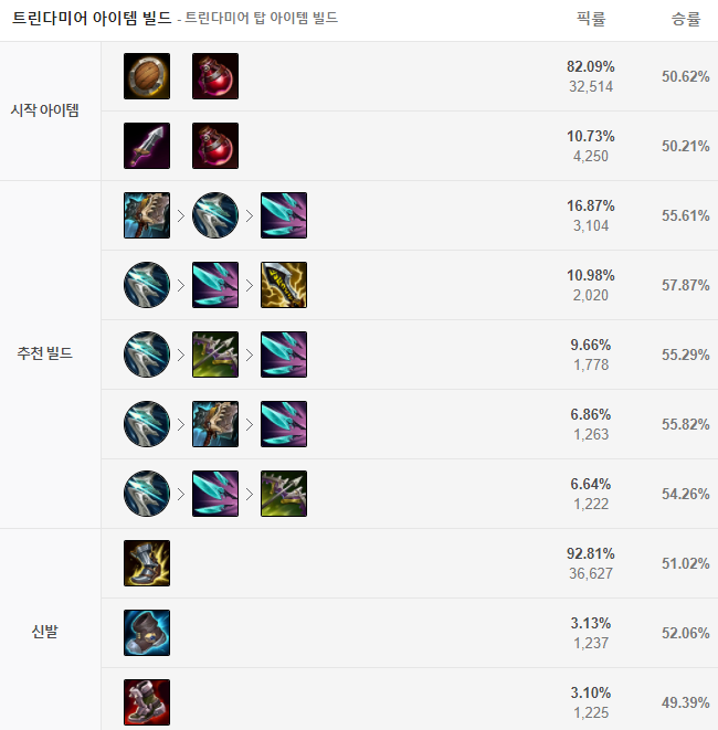 기본적인 트린다미어 템트리는 돌풍 - 나보리 신속검 - 무한의 대검 순서로 올려주시면 됩니다. 그러나 요즘 메타는 선체파괴자를 먼저 띄운 뒤 철거능력을 이용하여 스플릿 운영을 하는게 대세이기 때문에 선체파괴자를 먼저 올리는 템트리도 괜찮습니다. 신발의 경우 광전사의 군화를 올려주면 됩니다.