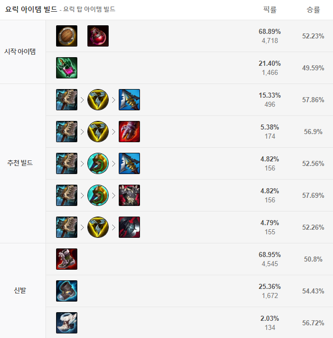 요릭 템트리는 라인 유지력에 좋은 도란의 방패와 포션 하나로 시작해줍니다. 이후 선체파괴자, 삼위일체, 세릴다의 원한 순서로 아이템을 올려주는게 제일 많이 사용됩니다. 신발은 상대 탑 라이너가 AD이면 판금 장화를, AP면 헤르메스의 발걸음을 코어템 하나를 띄워준 뒤 올려주면 됩니다. 그 이후의 선택지로는 스테락, 가시 갑옷, 칠흑의 양날도끼 등이 있습니다.