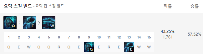 1레벨에는 Q스킬, 2레벨에는 E스킬, 3레벨에는 W스킬을 찍어준 뒤 이후 Q-E-W 순서로 스킬을 마스터해주시면 됩니다.