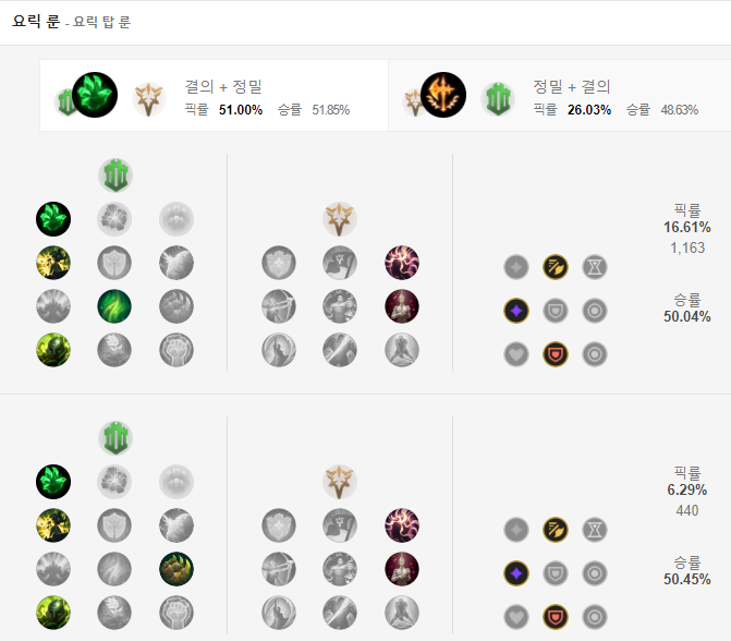 유지력 싸움에서 두각을 보이는 챔피언이기 때문에 요릭 룬은 결의에서 착취 룬을 메인으로 사용합니다. 하위 룬으로는 철거, 재생의 바람, 과잉 성장을 들어주면 되고 보조룬으로는 정밀 빌드에서 침착과 전설: 핏빛 길을 들어줍니다. 룬 파편에는 공격 속도와 적응형 능력치, 그리고 상대방이 AP면 마법 저항력, AD면 방어력을 들어줍니다.