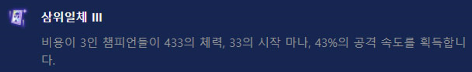 덱을 보면 알 수 있다시피 8명의 챔피언 중 무려 5명이 3코스트인 챔피언이기 때문에 삼위일체 시리즈가 강화술사 세나덱에 제일 좋습니다. 초반 증강체에서 삼위일체 시리즈가 나온 경우 강화술사 세나덱을 가면 순방 또는 우숭할 확률이 굉장히 높습니다.