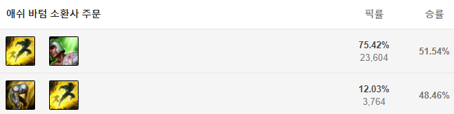 애쉬 스펠은 점멸과 회복을 들어주는 것이 좋습니다. 상대팀에 암살자나 브루저가 많고, 자신을 지켜줄 아군이 별로 없는 경우 탈진을 들어주기도 합니다.