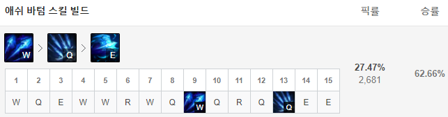 1레벨에는 W스킬을 찍어주고 2레벨에는 Q스킬, 3레벨에는 E스킬을 찍어줍니다. 이후에는 R-W-Q-E 순서로 스킬을 마스터해주면 됩니다.