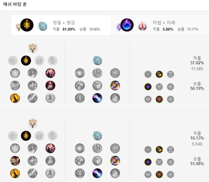 애쉬 룬은 정밀에서 치명적 속도를 들어줍니다. 하위 룬으로는 침착, 전설: 핏빛 길, 최후의 일격을 들어주고 보조룬으로는 영감에서 비스킷 배달과 쾌속 접근을 들어주어 도주 및 추노 능력을 올립니다. 룬 파편에는 공격 속도, 적응형 능력치, 방어력을 들어주면 됩니다.